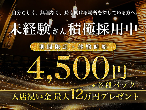 落ち着いた環境で、無理なく長く働きたい方にぴったりのラウンジです。 未経験の方も経験者の方も、それぞれのペースを大切にしながら成長できる職場。 騒がしさやギラギラ感が苦手な方でも、安心してスタートできます。 |